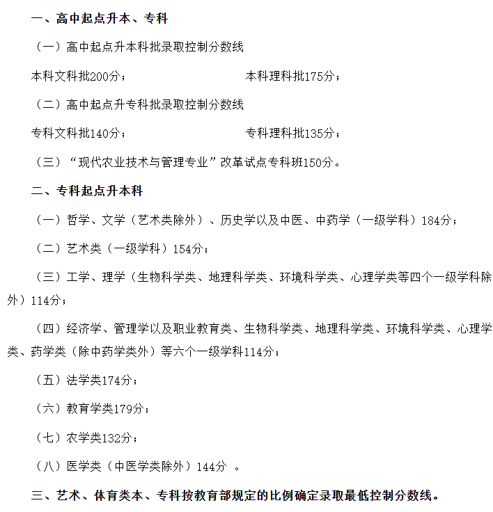 其中,高起本的分数线大约在140-200分左右,而专升本的分数线则大约在120-190分左右,艺术、体育类本、专科按教育部规定的比例确定录取最低控制分数线。